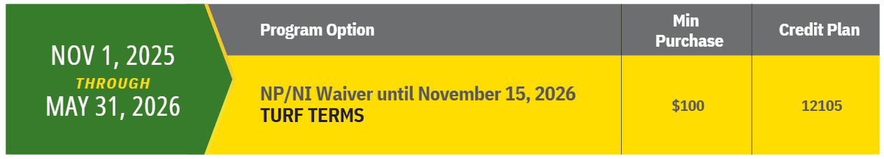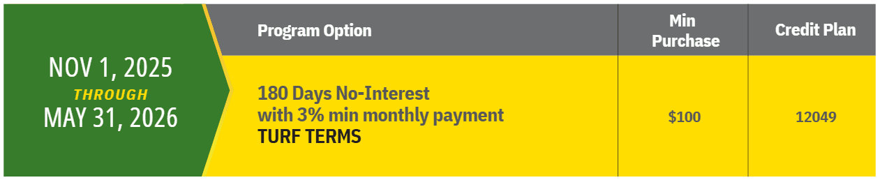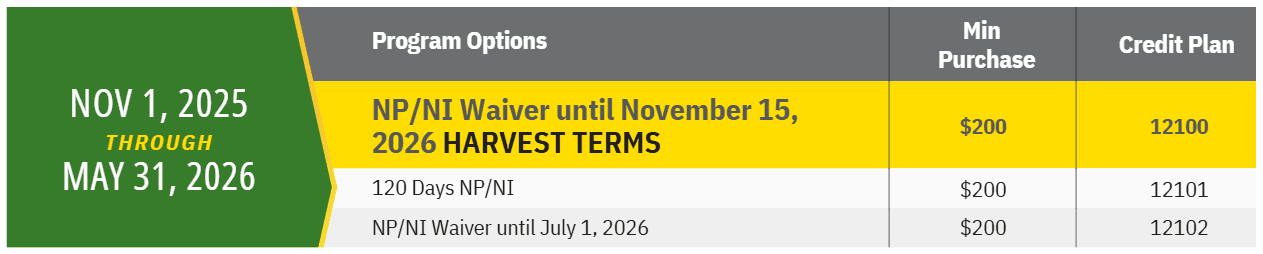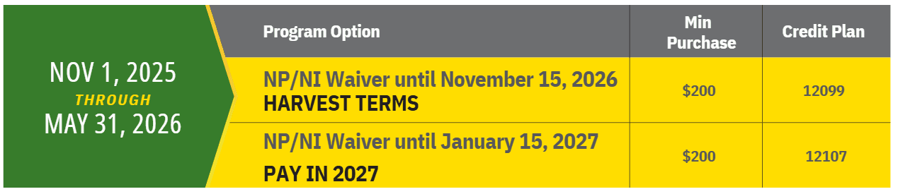 Offer valid on qualifying purchases made between 01 November 2025 to 31 May 2026 and is subject to approved credit on a Multi-Use Account, a service of John Deere Financial, f.s.b. No down payment required. 0.0% APR until 15 November 2026.