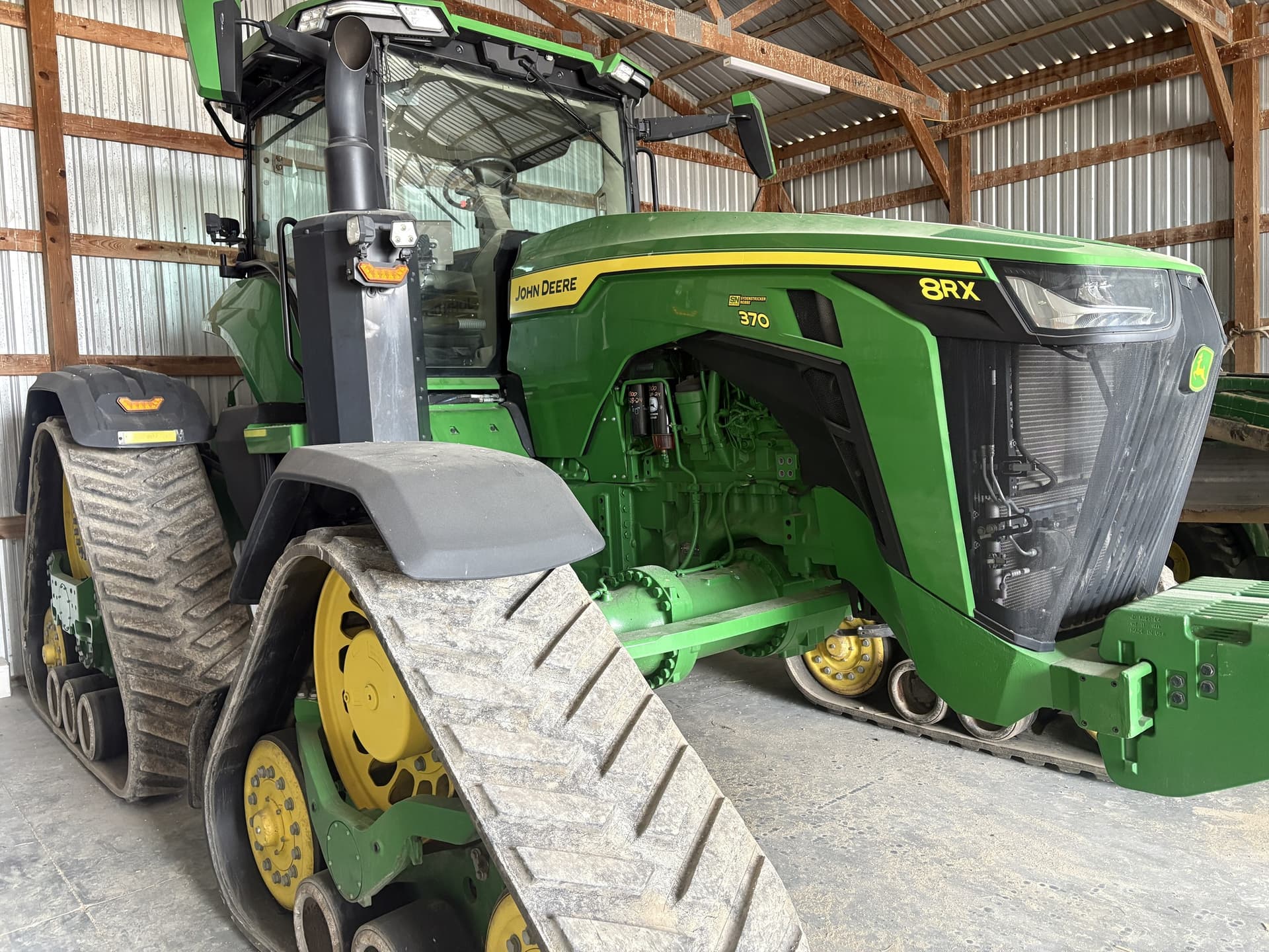 JOHN DEERE 8RX 370 MFWD, FOUR TRACK, CAB TRACTOR, 2021, Signature edition, 370hp, 9 LITER, 6 cylinder diesel engine, E23 Power Shift transmission w/efficiency manger (25 mph), right hand reverser w/ bump to shift controls, Premium cab with cab suspension, HVAC, ultimate comfort and convenience pkg, premium leather air seat, leather folding buddy seat, premium touch screen AM/FM radio, LED beacon lights, refrigerator, ultimate visibility upgraded LED lighting, load sensing hydraulic power steering, Gen 4, 4600 command center (10″) display w/Automation 3.0 activation for auto-trac, section control, row-Sense, data sync, in-field data share, implement guidance and turn automation, includes integrated JD Starfire 6000 RTK ready global position receiver (requires subscriptions), JDLink MTG, 84 GPM dual hydraulic pump, 5 rear remote SCV outlets, 5 standard flow with high pressure relief, auxiliary case drain couplers, power beyond pressure coupler, load sense coupler, independent 1000 RPM (1 3/4″) rear PTO, Cat 4 drawbar w/HD support (2″ pin), Cat 4N three point hitch w/quick coupler (20,000#), rear fender mounted control switches, 120″ track spacing, 24″ Camso AG 4500 rear tracks, 24″ Camso 4500 front tracks, 144″ outside to outside, polyurethane mid rollers, 24″ upper & lower front fenders, front weight support with starter weight and 12 front suitcase weights.