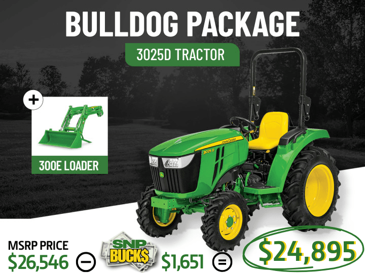 Tackle tough terrain and heavy-duty chores with the John Deere 3025D Bulldog Package. Built for rugged performance and mechanical reliability, this package is ideal for landowners, ranchers, and homesteaders who demand more from their equipment.