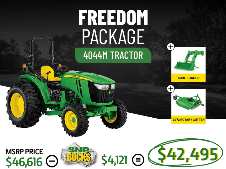 Unleash Power and Precision with the John Deere 4044M Freedom Package. Harness serious horsepower with the John Deere 4044M Freedom Package. Built for large-acreage landowners, ranchers, and rural professionals, this heavy-duty compact utility tractor delivers unmatched strength, control, and comfort for the toughest jobs—season after season.