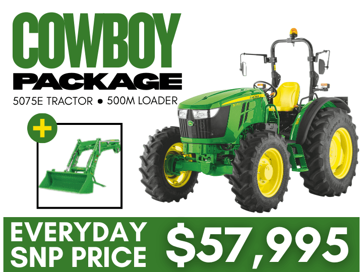 Step into serious horsepower with The Cowboy Tractor Package, featuring the dependable John Deere 5075E MFWD Open Station Tractor paired with the tough and versatile 500M Loader. Whether you're managing livestock, maintaining acreage, feeding hay, or working through tight barns and corrals, this package delivers the muscle, maneuverability, and durability today’s ranchers demand.