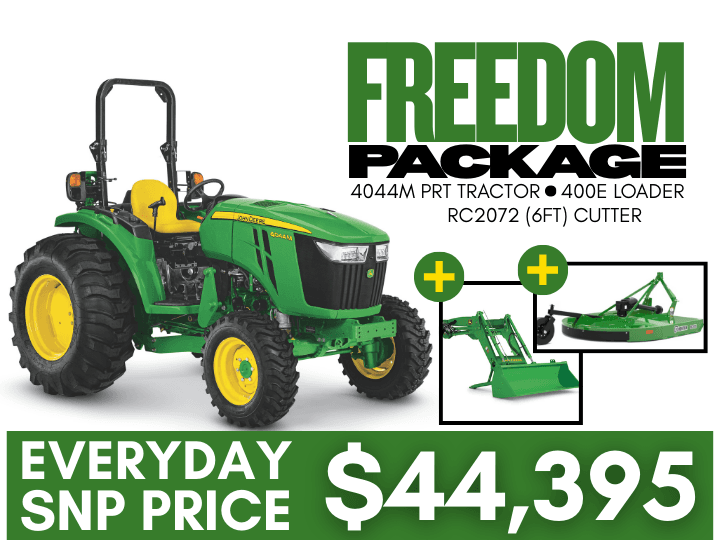 The Freedom Package brings together the workforce strength of the John Deere 4044M, the heavy‑duty lifting power of the 400E Loader, and the wide‑cut efficiency of the RC2072 Rotary Cutter. Designed for landowners and professionals who demand high horsepower, serious lift capacity, and rugged cutting performance—this package is built to conquer fields, brush, livestock acreage, and tough terrain.