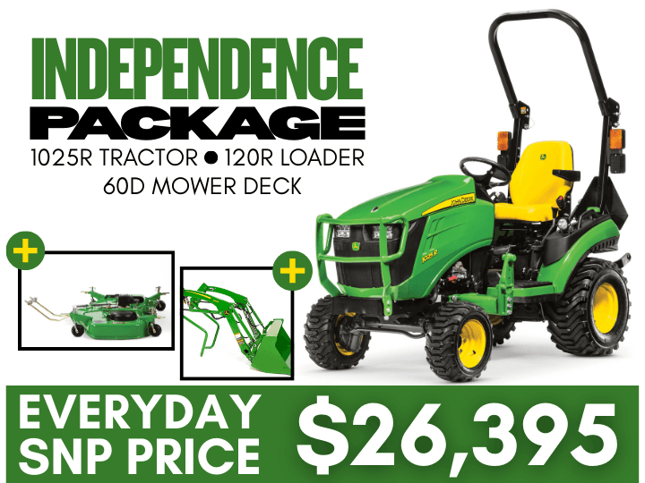 The Independence Package delivers John Deere’s most popular sub‑compact tractor configuration: the 1025R, paired with the versatile 120R Loader and the ultra‑convenient 60D AutoConnect™ Mower Deck. This package is designed for property owners who want comfort, capability, and unmatched ease of use—all in one premium setup.