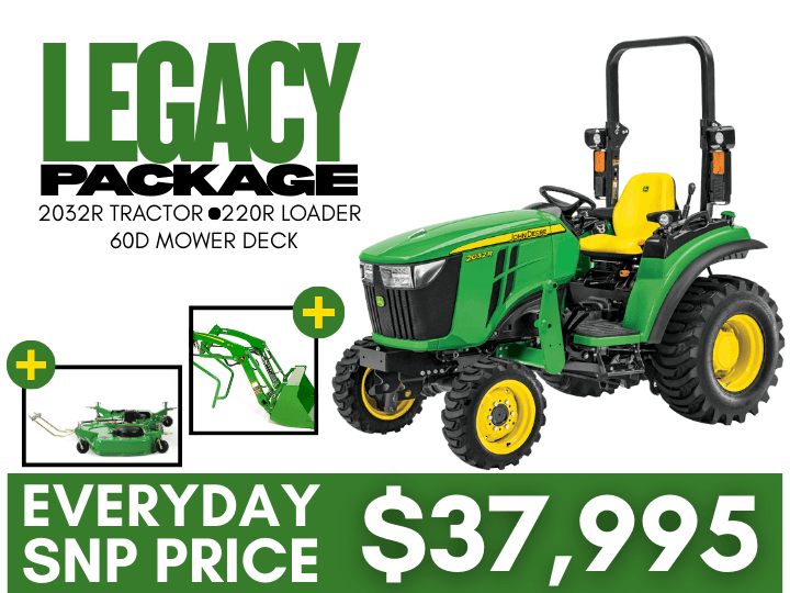 The Legacy Package pairs the strong and stable John Deere 2032R with the heavy‑duty 220R Front Loader and the convenient 60D AutoConnect™ Drive‑Over Mower Deck. This is the ideal upgrade for acreage owners, landscapers, and professionals who need more lift, more cut, and more capability than entry‑level compacts can deliver.